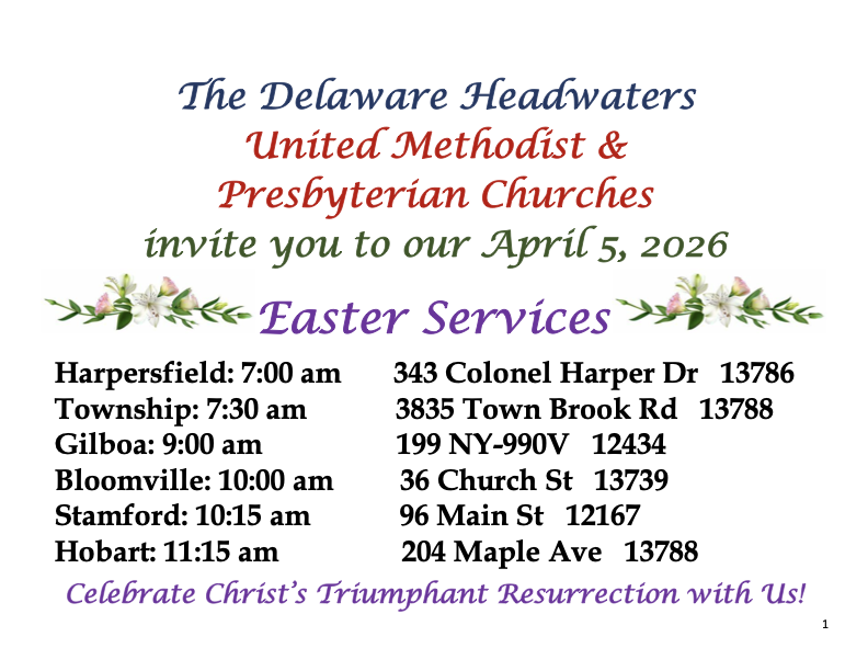 The Delaware Headwaters Charge has brought together Bloomville UMC, Conesville Chapel, Gilboa UMC, Harpersfield UMC, Hobart UMC, First Presbyterian Church/Stamford UMC, and Township UMC under the direction of Pastor Dawn Richard and Pastor Peggy Laemmel. We are happy to have you as a member or a visitor to our churches. God has been doing wonderful things in our communities . . . we invite you to come, share in the fellowship, take root, and grow with us.